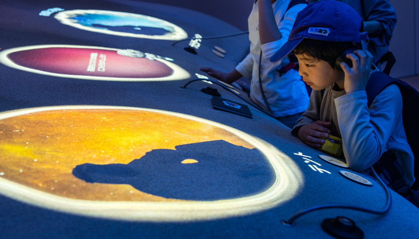 The pavilion unfolded as a journey through four themed environments, each designed to shift perception through scale, mood, and storytelling. Among them, two rooms defined my main contribution. "Dawn in the Desert" immersed visitors in a scenographic landscape where Kuwait’s early identity as a hub of trade and culture came to life. AI-enhanced exhibits invited exploration, revealing fragments of history through tactile discovery and playful interaction.